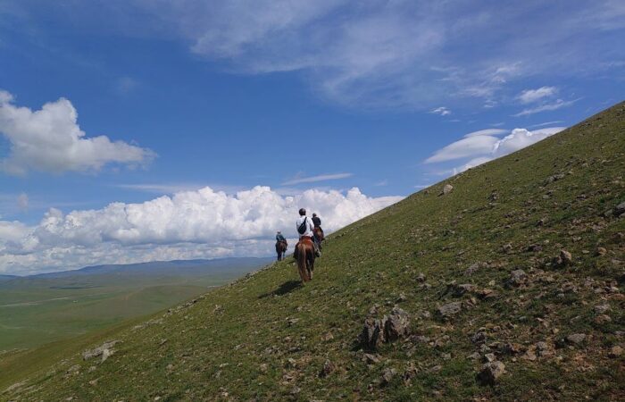 午前:乗馬スタッフから馬の扱い方や基本的な乗り方の指導を受け、キャンプ周辺で練習します。初日は草原の環境と馬に慣れることが大切です。練習中、乗馬ガイドが一人ひとりの様子を確認し、乗馬レベルを判断します。午後:上達の度合いに応じてグループ分けを行い、ガイドの案内のもと、それぞれのペースで乗馬をお楽しみいただきます。夜:天気が良ければ満天の星空が広がり、草原を渡るそよ風と静寂に包まれながら、快適なゲルでお休みいただけます。